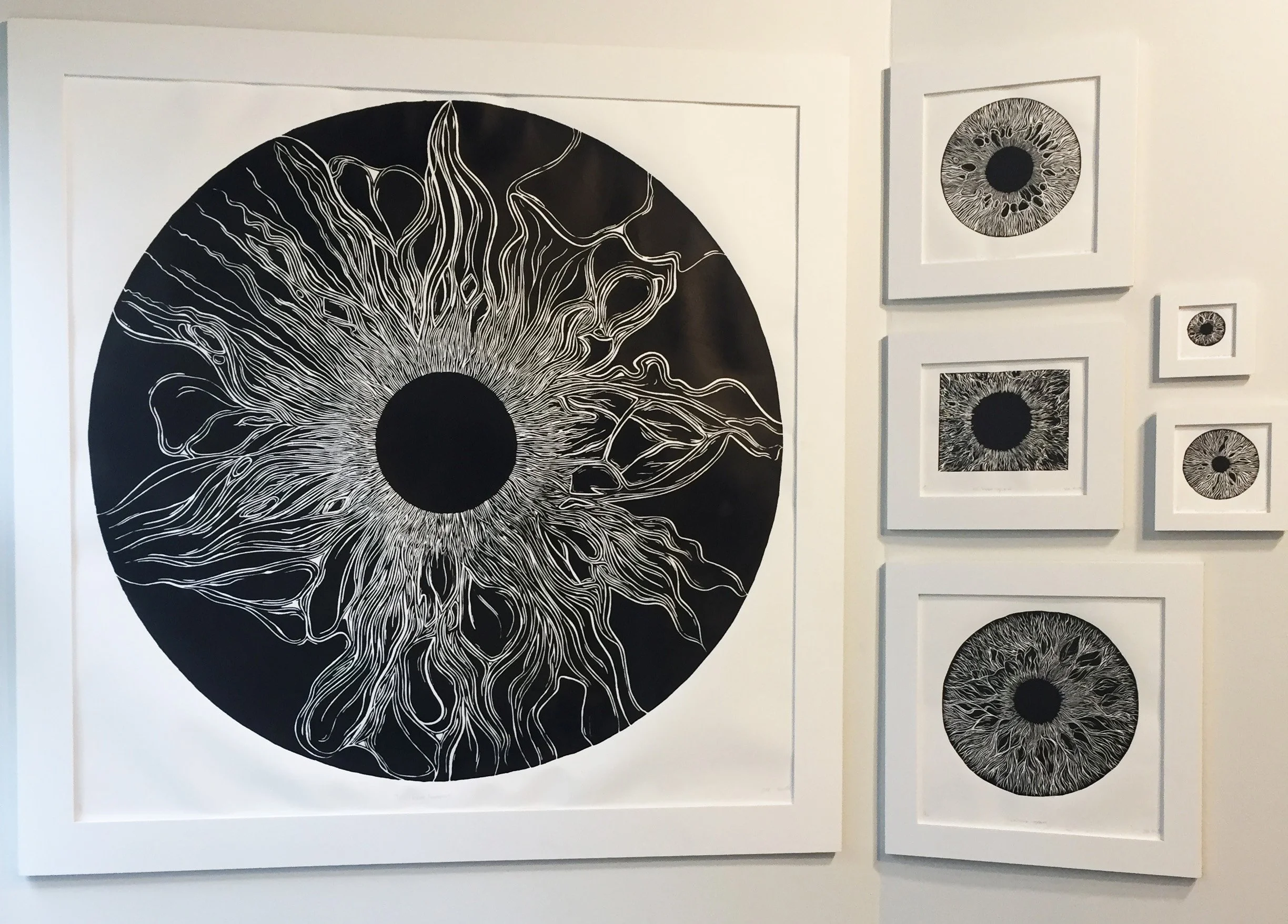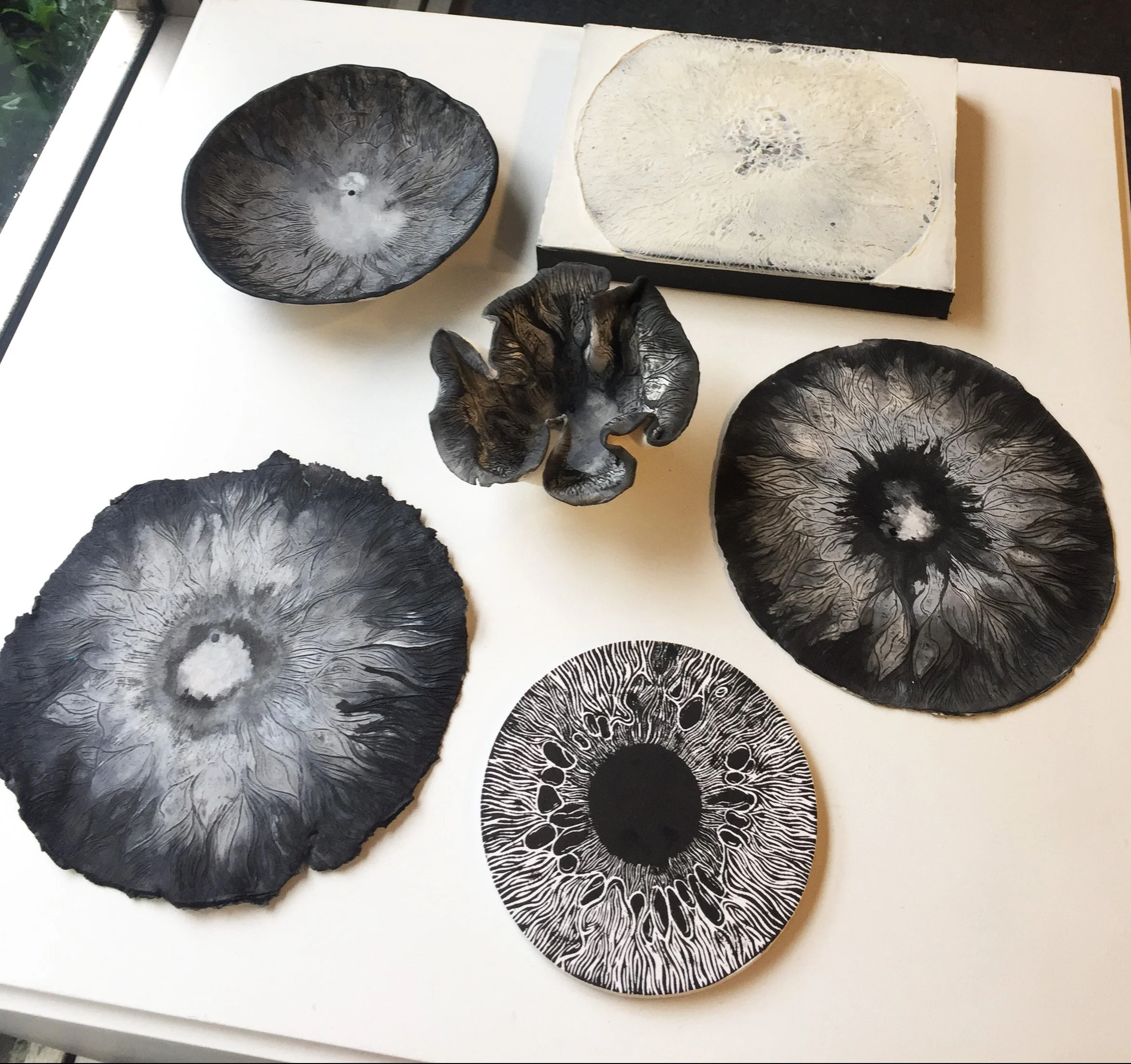 Linocut relief on Whitetrace paper, watercolour and ink on embossed stoneware, embossed gel medium on canvas, dimensions variable.